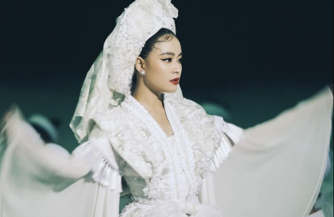 Đáng chú ý nhất phải kể đến chiếc váy dáng áo choàng (cape) với hoa văn Á Đông của Hoàng Thùy Linh. Nữ ca sĩ đã mê hoặc công chúng với chiếc váy dáng cape mang đậm âm hưởng hoàng gia của NTK Tăng Thành Công. Bộ trang phục tôn lên nét quyền quý, thanh tao thời hiện đại.