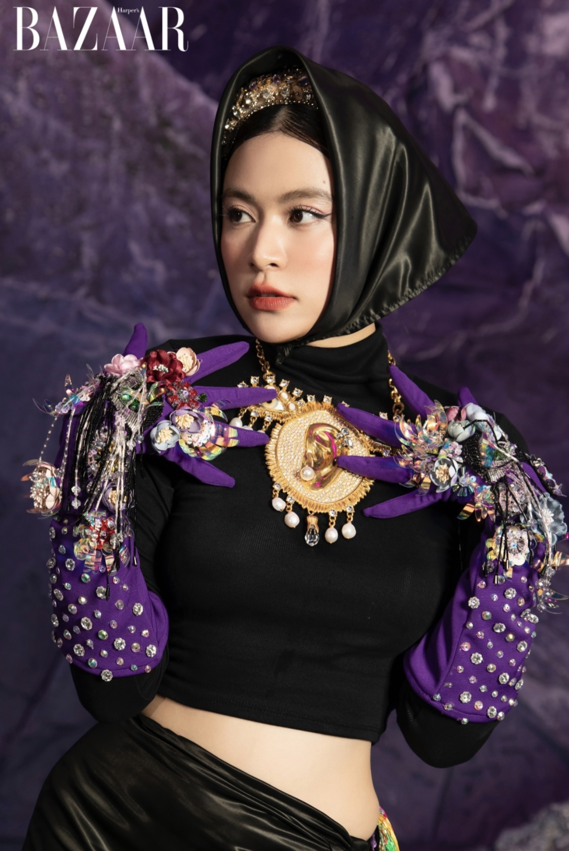 Những thiết kế của NTK Thuỷ Nguyễn thể hiện trọn vẹn hình ảnh của một "nữ chúa" đầy uy quyền trong cung đình thời xưa. Đây là một thiết kế dành riêng cho Hoàng Thuỳ Linh với phần áo choàng khá lớn cộng thêm hoa văn tranh đông hồ tinh xảo đậm chất dân gian, gam màu đen - vàng đan xen tạo hiệu ứng thị giác cao, đồng thời thể hiện được khí chất Hoàng gia cho hình ảnh của nữ ca sĩ.