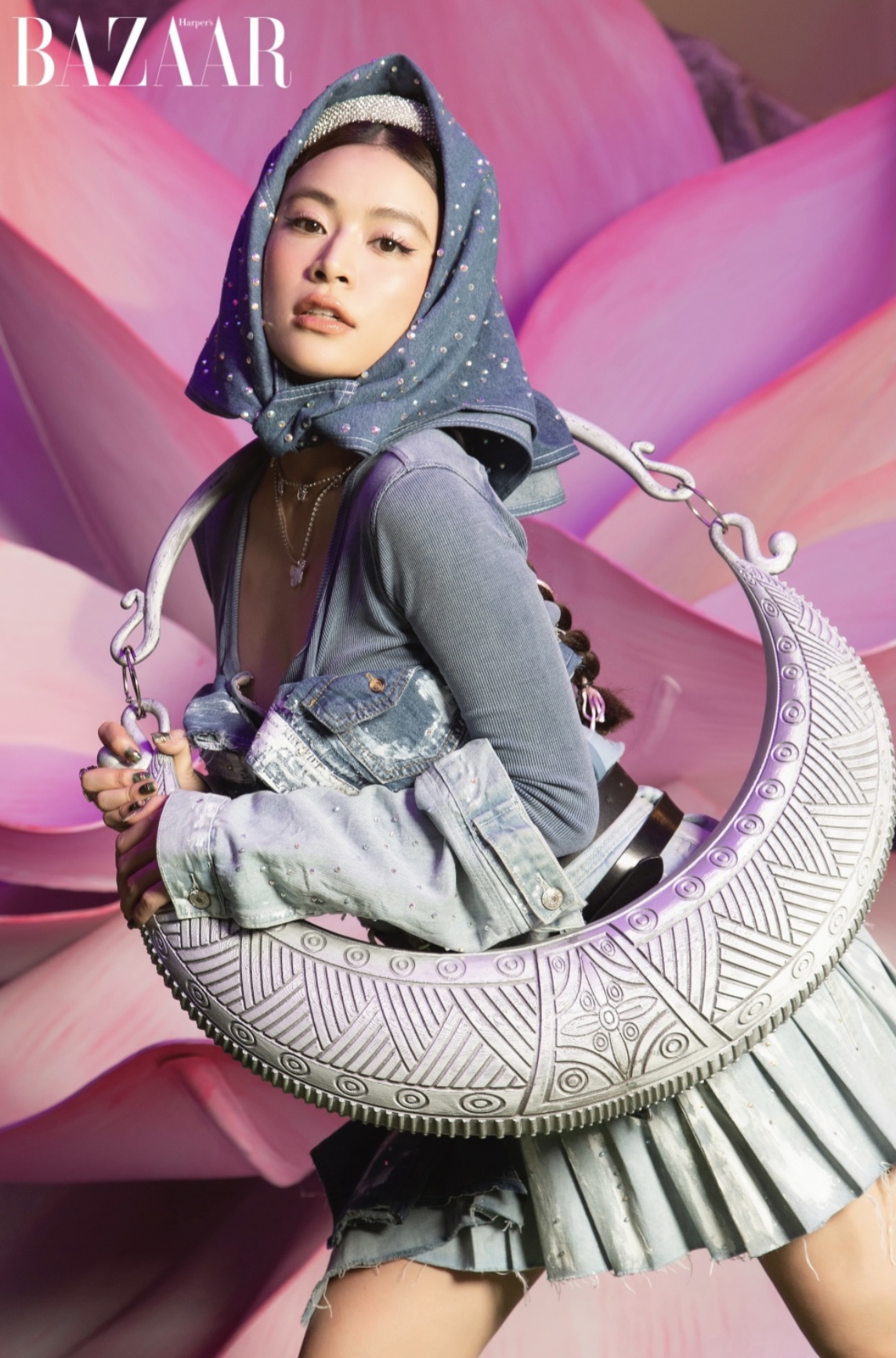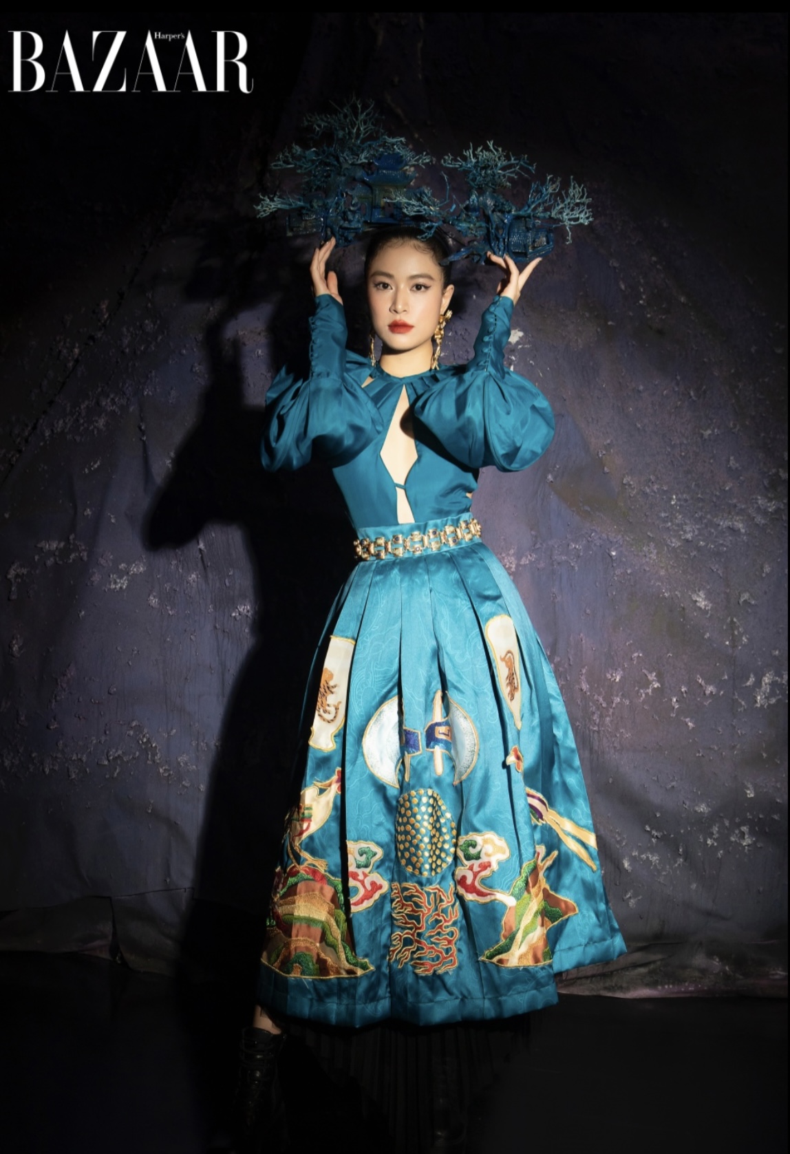 Thiết kế váy chiết eo hoa văn thêu chim hạc - hình ảnh thường thấy trong trang phục dành cho những người phụ nữ quyền lực của cung đình thời xưa, một bên vai điểm chi tiết vải mô phỏng cánh hạc tung bay của NTK Cory Trần giúp hình ảnh nữ ca sĩ thêm mơ màng và mong manh hơn bội phần.