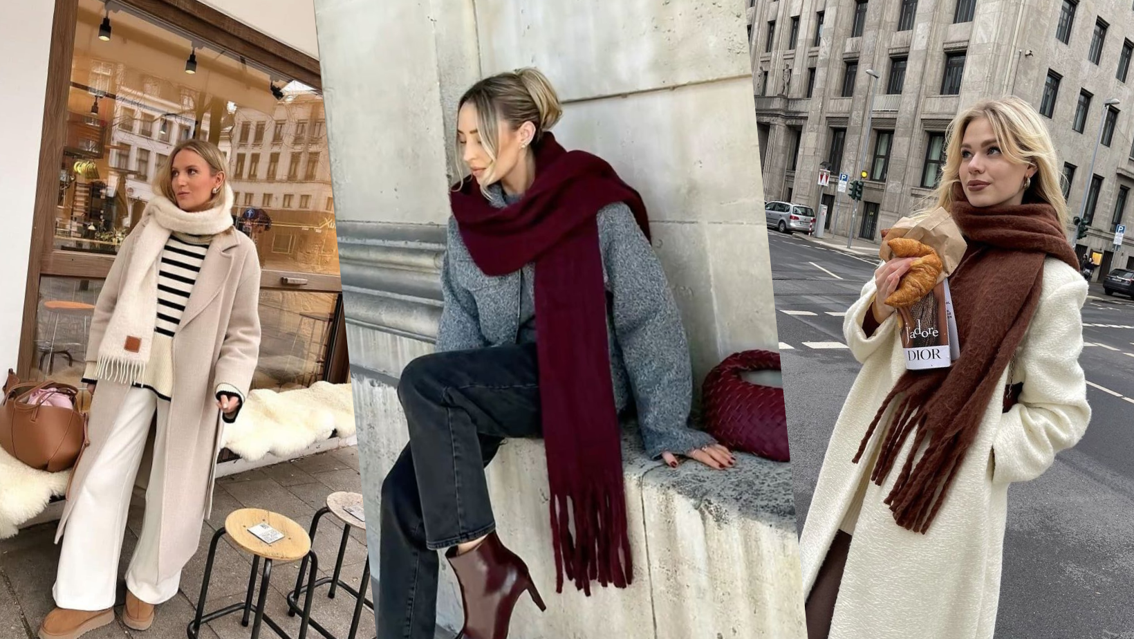 Khăn len luôn là mảnh ghép giúp outfit mùa đông có chiều sâu và sắc thái riêng. Từ khăn len bản to, khăn dài đến những mẫu khăn handmade, mỗi kiểu đều mang đến một hiệu ứng khác nhau nhưng đều góp phần làm phong cách thêm trọn vẹn. Với những outfit mang tông trung tính, một chiếc khăn pastel như hồng nhạt, kem hay be sẽ làm tổng thể mềm mại và sáng hơn tạo cảm giác dịu dàng trong mùa lạnh. Khi kết hợp cùng áo dạ dáng dài hoặc áo khoác suông, chiếc khăn lại trở thành linh hồn của sự thanh lịch. Dáng quàng lệch sang một bên hoặc đơn giản buông nhẹ hai đầu sẽ gợi nên vẻ phóng khoáng rất tự nhiên nhưng đầy chủ ý.