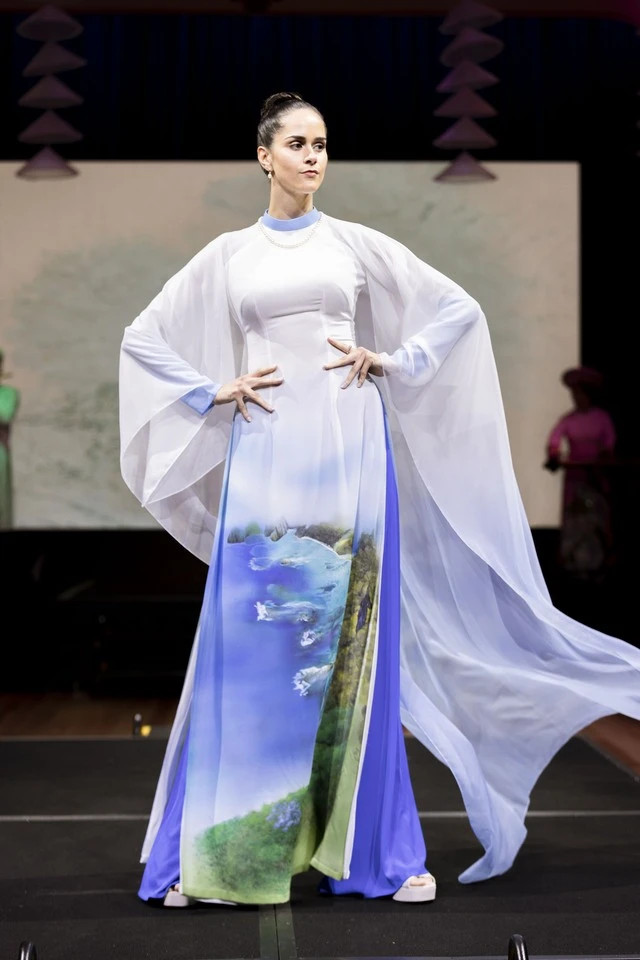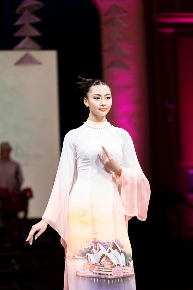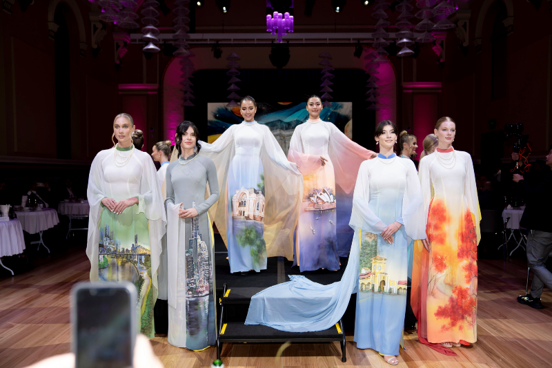 Trong khuôn khổ chương trình Roadshow Du lịch Việt Nam – TP.HCM, diễn ra tại Úc, NTK Trung Đinh đã giới thiệu BST “Khúc giao mùa” được làm từ chất liệu lụa nhuộm ombre thủ công với màn trình diễn của hai hoa hậu Việt - Ngọc Châu và Xuân Hạnh, hai hoa hậu Úc cùng dàn người mẫu quốc tế.
