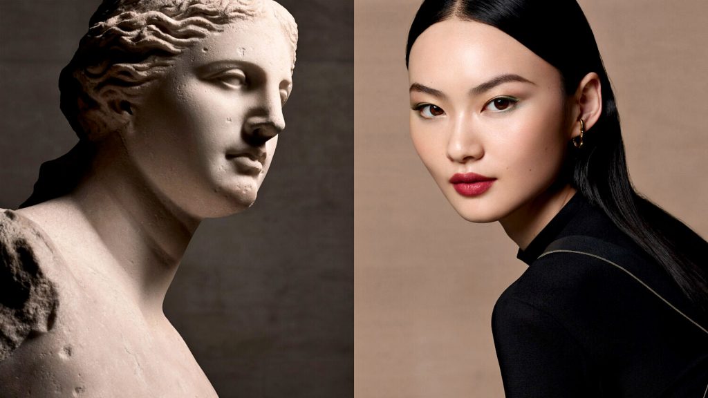 Người mẫu He Cong “sánh vai” cùng Tượng thần Vệ Nữ thành Milo, tái hiện vẻ đẹp tối thượng và là biểu tượng của sự hoàn hảo. Bức tượng này được cho là tượng trưng cho Aphrodite, vị nữ thần tình yêu và sắc đẹp Hy Lạp.
