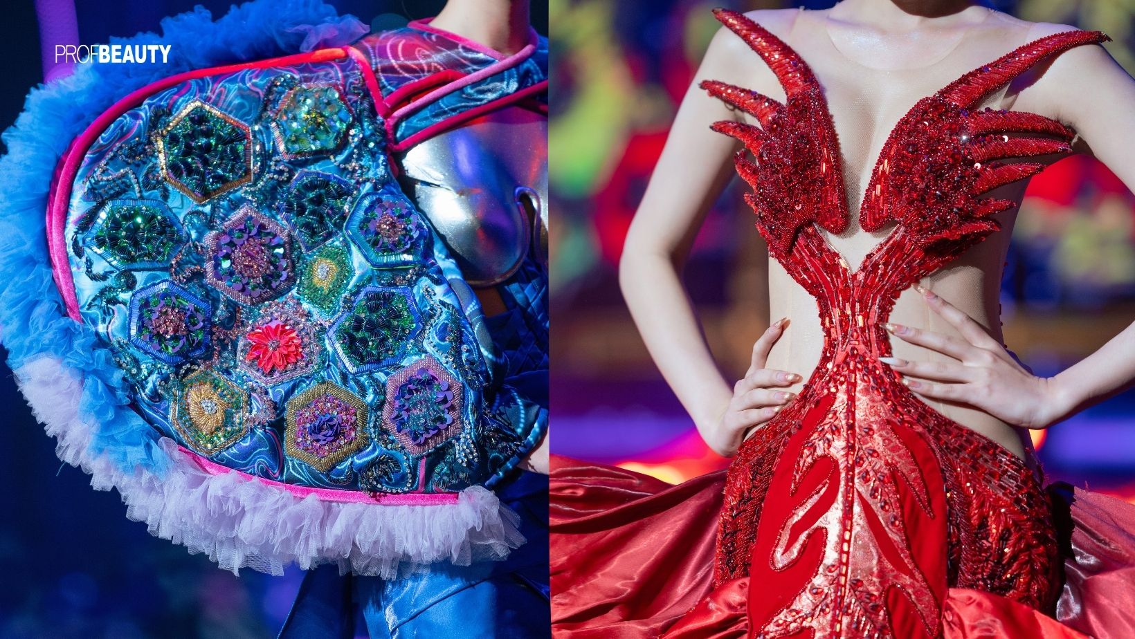Tà váy nổi bật với gam màu đỏ rực, lấy cảm hứng từ Phụng lửa. Những họa tiết lấp lánh như ánh lửa bập bùng tạo hiệu ứng mạnh mẽ, thu hút ánh nhìn ngay từ phút đầu.