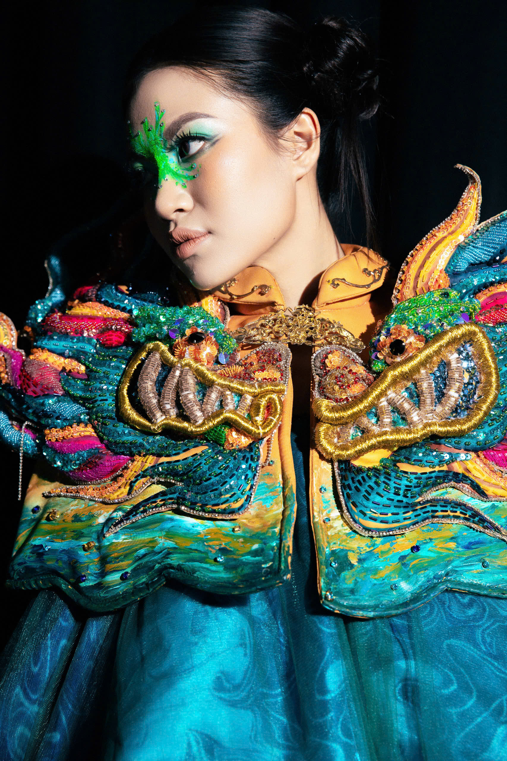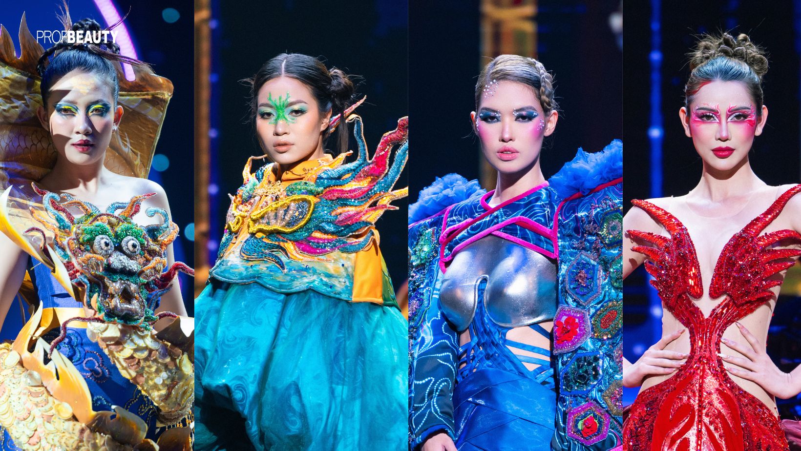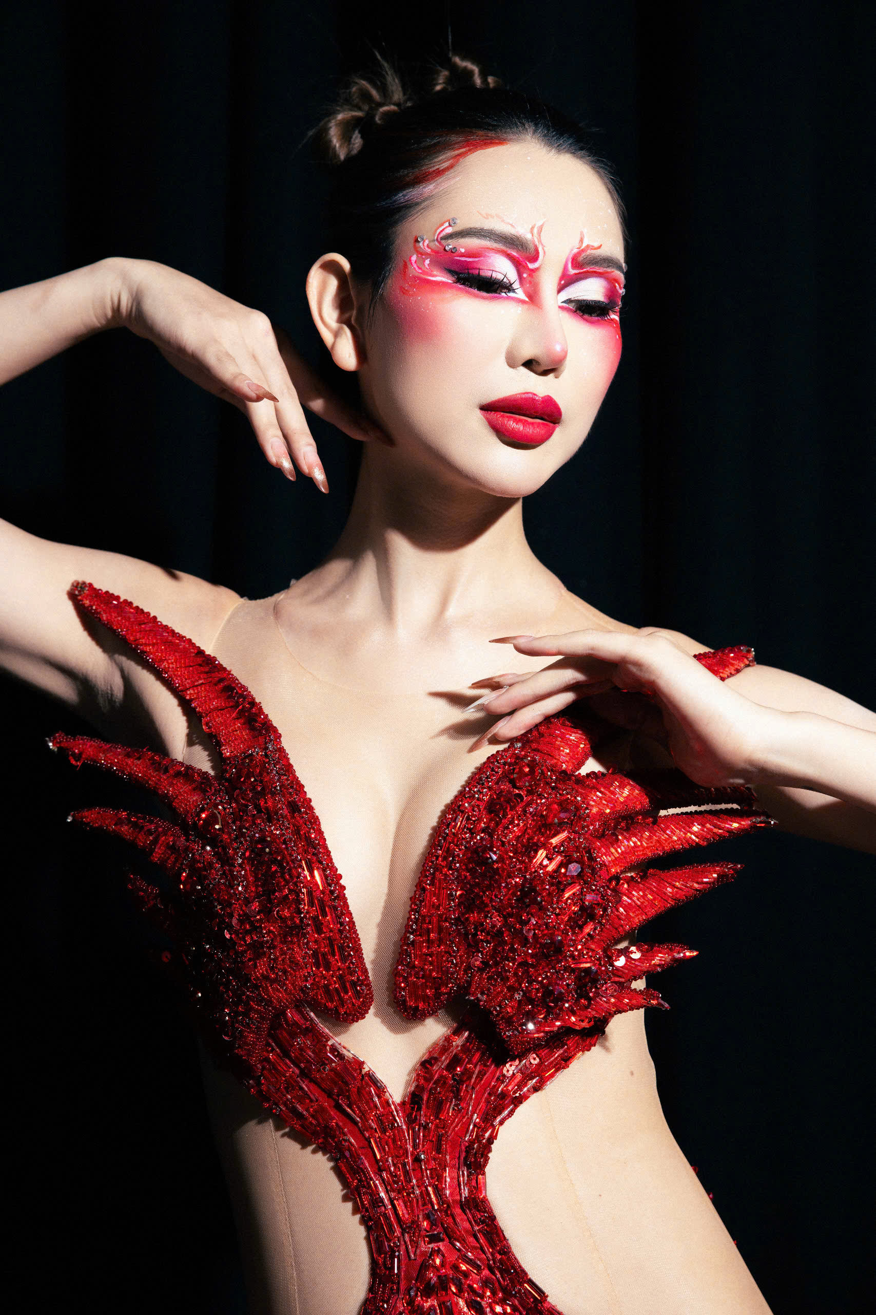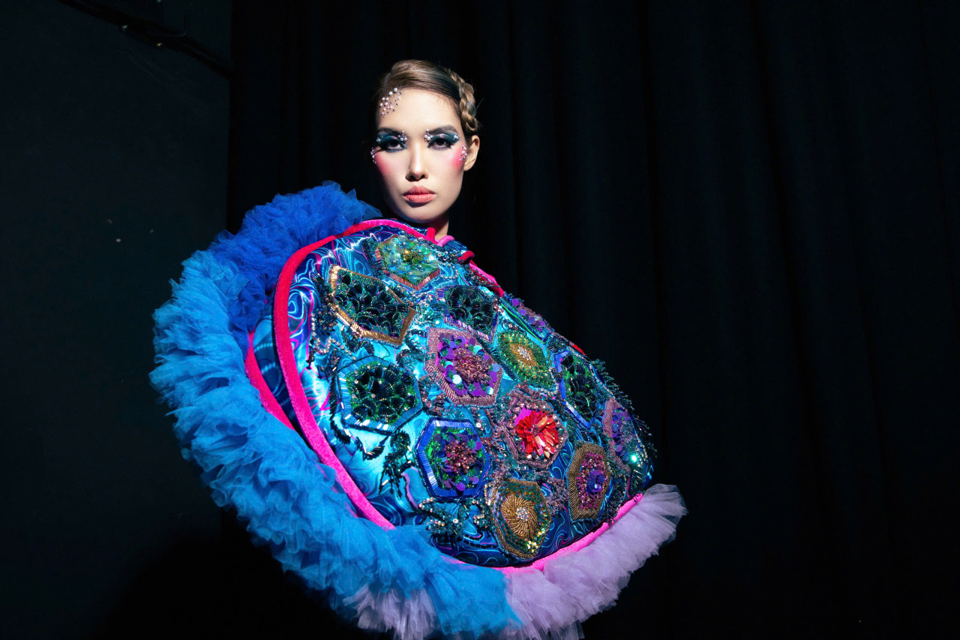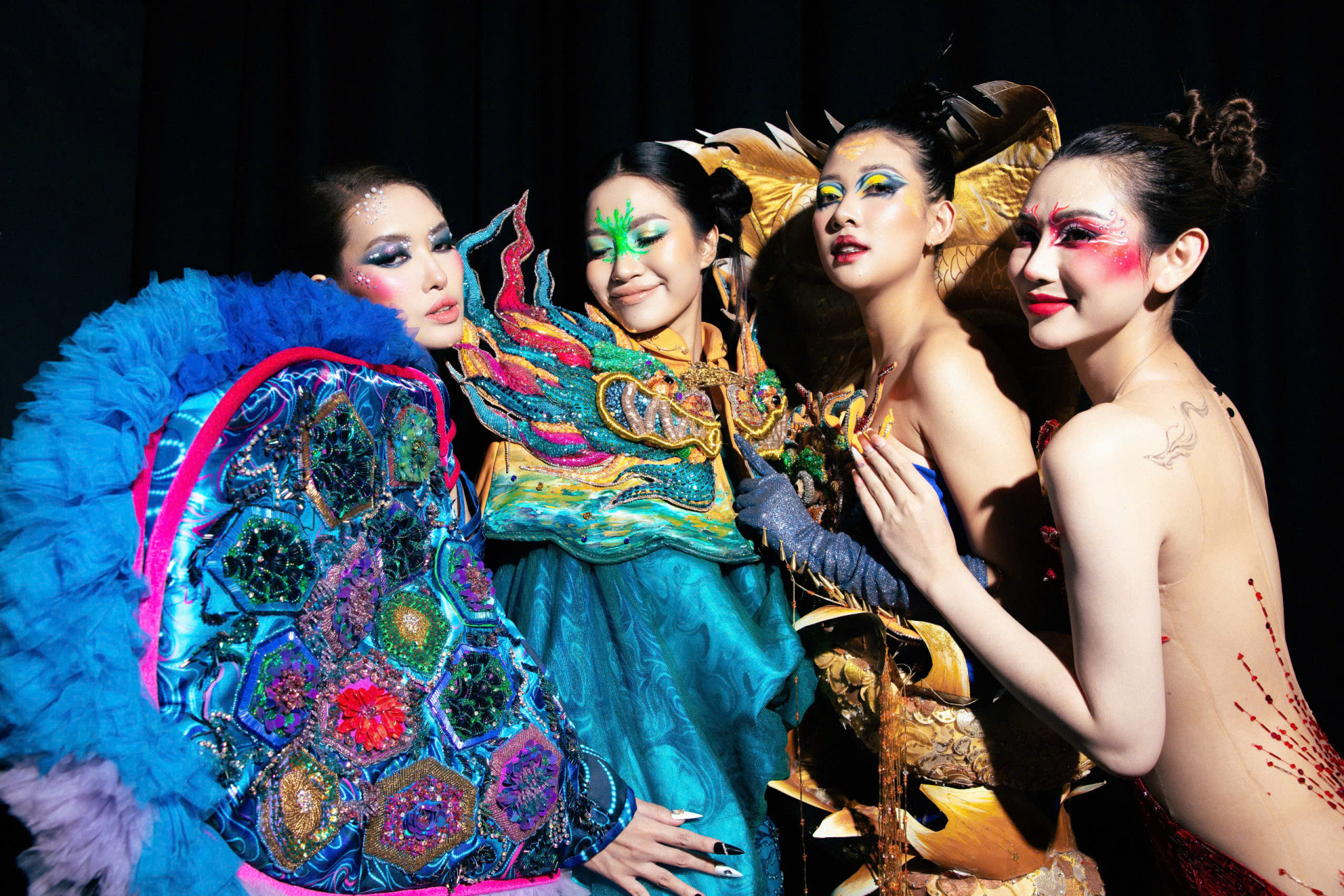 Đội ngũ chuyên gia makeup đóng vai trò không thể thiếu trong thành công của buổi trình diễn, chuyên gia Minh Ngọc - An Nguyễn đã tạo ra những layout trang điểm độc đáo, kết hợp hoàn hảo giữa sự sáng tạo và bản sắc văn hóa. Mỗi người mẫu không chỉ được trang điểm tinh tế mà còn thể hiện được thần thái và cá tính riêng biệt, làm nổi bật vẻ đẹp của từng thiết kế.