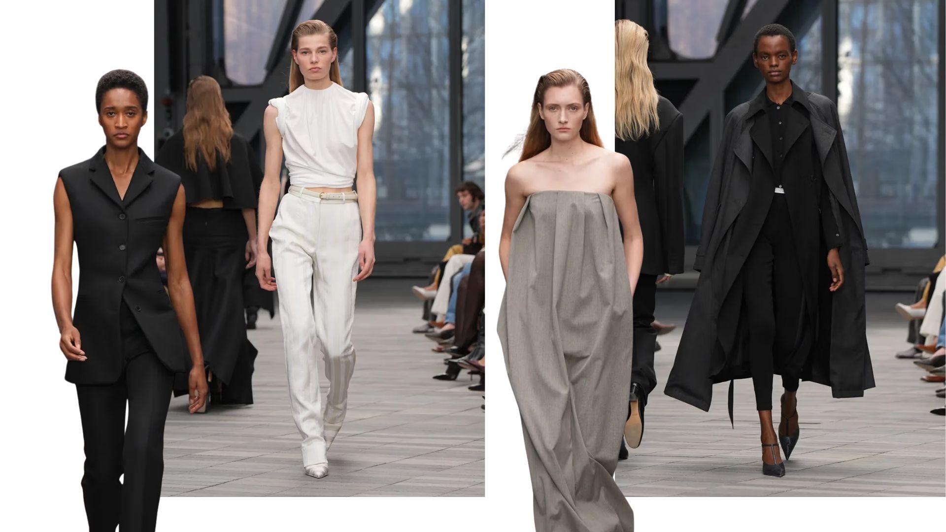 Cảm hứng đưa nội y ra ngoài làm trang phục dạo phố được thể hiện đầy ý nhị qua những lớp vải mỏng manh như sương quấn quýt lấy hình thể. Thay vì phô trương, những chi tiết này lại tạo cảm giác riêng tư, nâng niu từng đường nét tự nhiên của người phụ nữ. Ngay cả trong những thiết kế kín đáo như áo vest vai rộng hay những bộ âu phục mang hơi hướng nam tính, người ta vẫn thấy hiện hữu một vẻ đẹp quyền lực. Đó là hình ảnh gợi nhắc về thời kỳ phái đẹp tự tin bước vào thế giới công sở và dùng chính trang phục để khẳng định bản lĩnh cá nhân.
