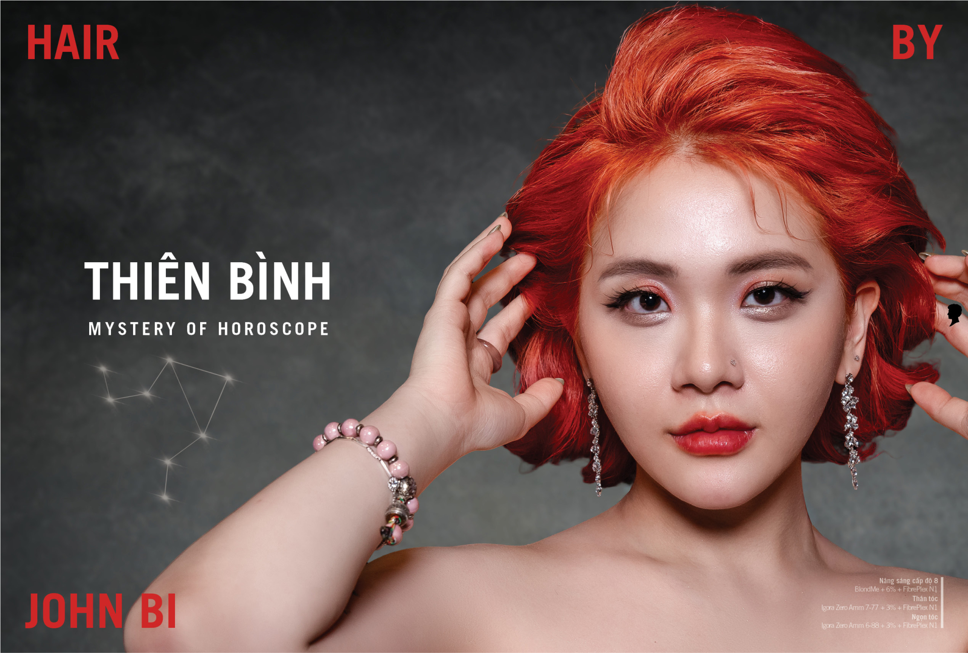 Với thiết kế Thiên Bình, Chuyên gia John Bi chọn những sắc đỏ hồng san hô với kết cấu mềm mại, kết hợp với kiểu cắt gọn, tạo độ phồng tự nhiên ở phần mái và đuôi, tạo nên tổng thể thanh lịch, hài hòa đúng tinh thần cung hoàng đạo mang biểu tượng cân bằng. Thiên Bình trong thiết kế này không chỉ là kiểu tóc mà là biểu đạt sống động của sự cân bằng, tự do và nét tinh tế không thể nhầm lẫn.