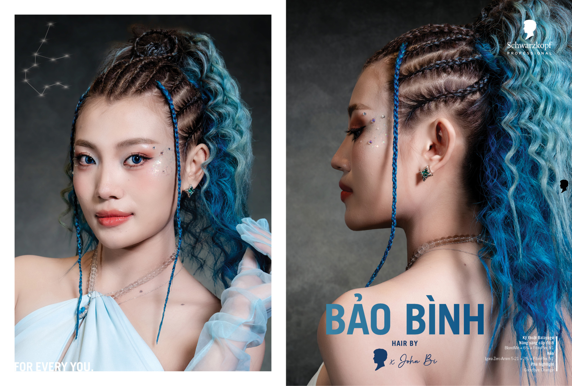 Mẫu tóc Bảo Bình đại diện cho sự khác biệt và tầm nhìn tương lai. Chuyên gia John Bi khai thác điều này qua những mảng màu xanh lam khói tại phần thân tóc kết hợp với kiểu tết tóc độc đáo, kết cấu sắc nét nhưng mềm mại, tạo nên dáng vẻ hiện đại, phóng khoáng và đầy ý niệm. Mỗi đường nét đều gợi cảm giác tiến về phía trước, mở ra những khả năng vô hạn của tư duy sáng tạo.