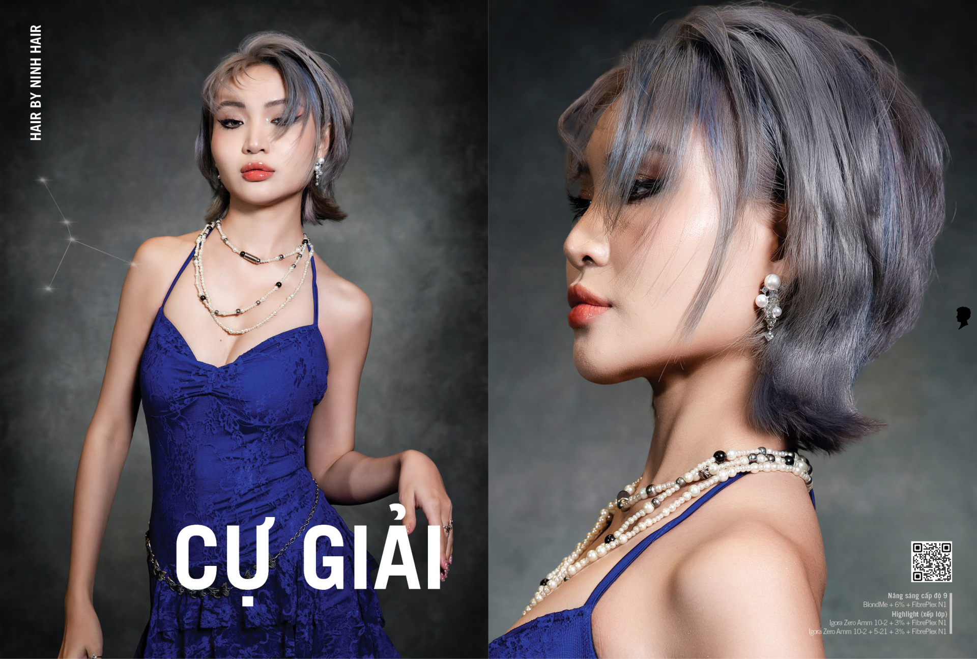 Bộ sưu tập mở ra với mẫu tóc Bọ Cạp, nơi sắc xám bạc kết hợp ánh tím lạnh tạo nên cảm giác bí ẩn, mạnh mẽ và kiêu hãnh, thể hiện sức mạnh nội tâm sâu thẳm. Tiếp đến, mẫu tóc Cự Giải hiện lên dịu dàng như mặt biển phản chiếu ánh trăng với tông xanh ánh khói, mái tóc được tạo kết cấu nhẹ, dịch chuyển tự nhiên gợi nhắc sự yên bình và mềm mại của làn nước tĩnh lặng.