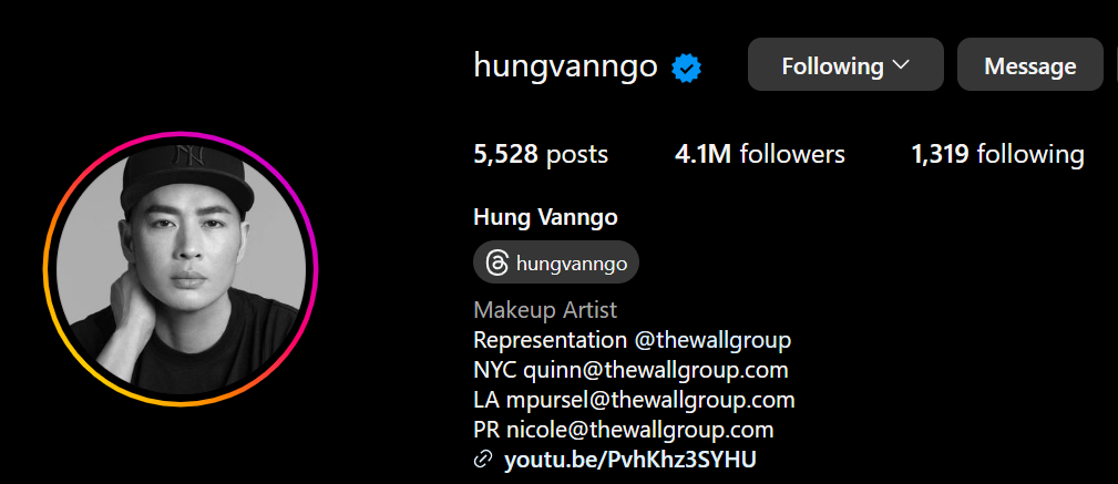 Hung Vanngo là chuyên gia trang điểm quen thuộc của nhiều ngôi sao Hollywood nổi tiếng như Jennifer Lawrence, Bella Hadid, Miranda Kerr và là bạn thân của nữ ca sĩ Selena Gomez. Anh được Cosmopolitan xếp thứ 4 trong top 14 nghệ sĩ trang điểm nổi bật thế giới.
