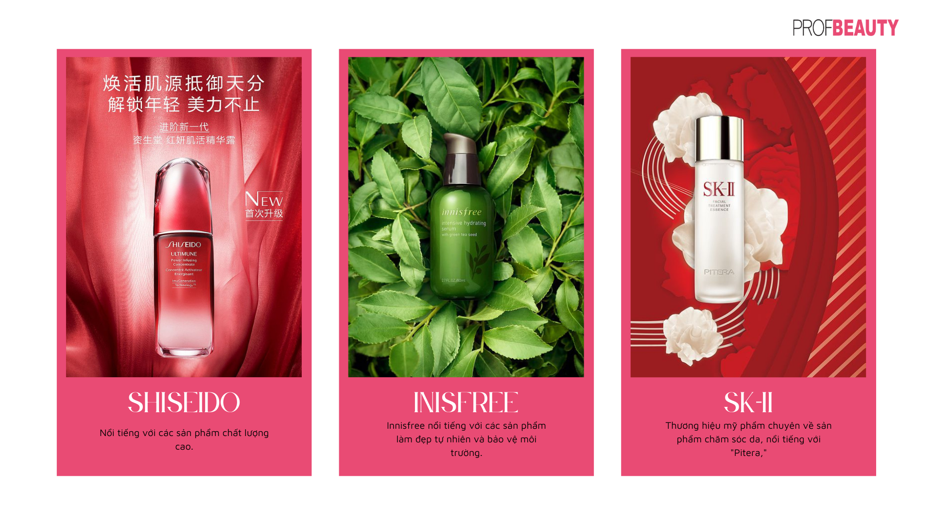 Shiseido (Nhật Bản): Shiseido là một trong những thương hiệu mỹ phẩm lâu đời nhất và nổi tiếng với các sản phẩm chất lượng cao.