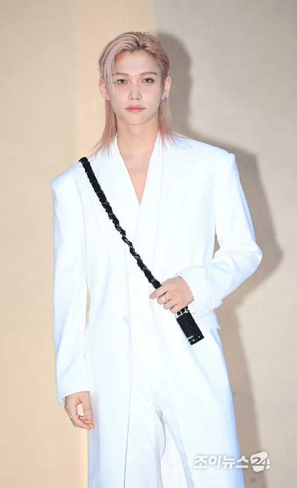 Felix ngay lập tức trở thành tâm điểm với mái tóc hồng pastel được vuốt ngược slick back đầy ấn tượng. Anh chàng diện một set đồ trắng tối giản nhưng cực kỳ phong cách, kết hợp với layout makeup nhấn vào đôi mắt sâu. Toàn bộ tạo hình của Felix toát lên khí chất của một "IT boy thế hệ mới" táo bạo, thời thượng và đậm chất vị lai.