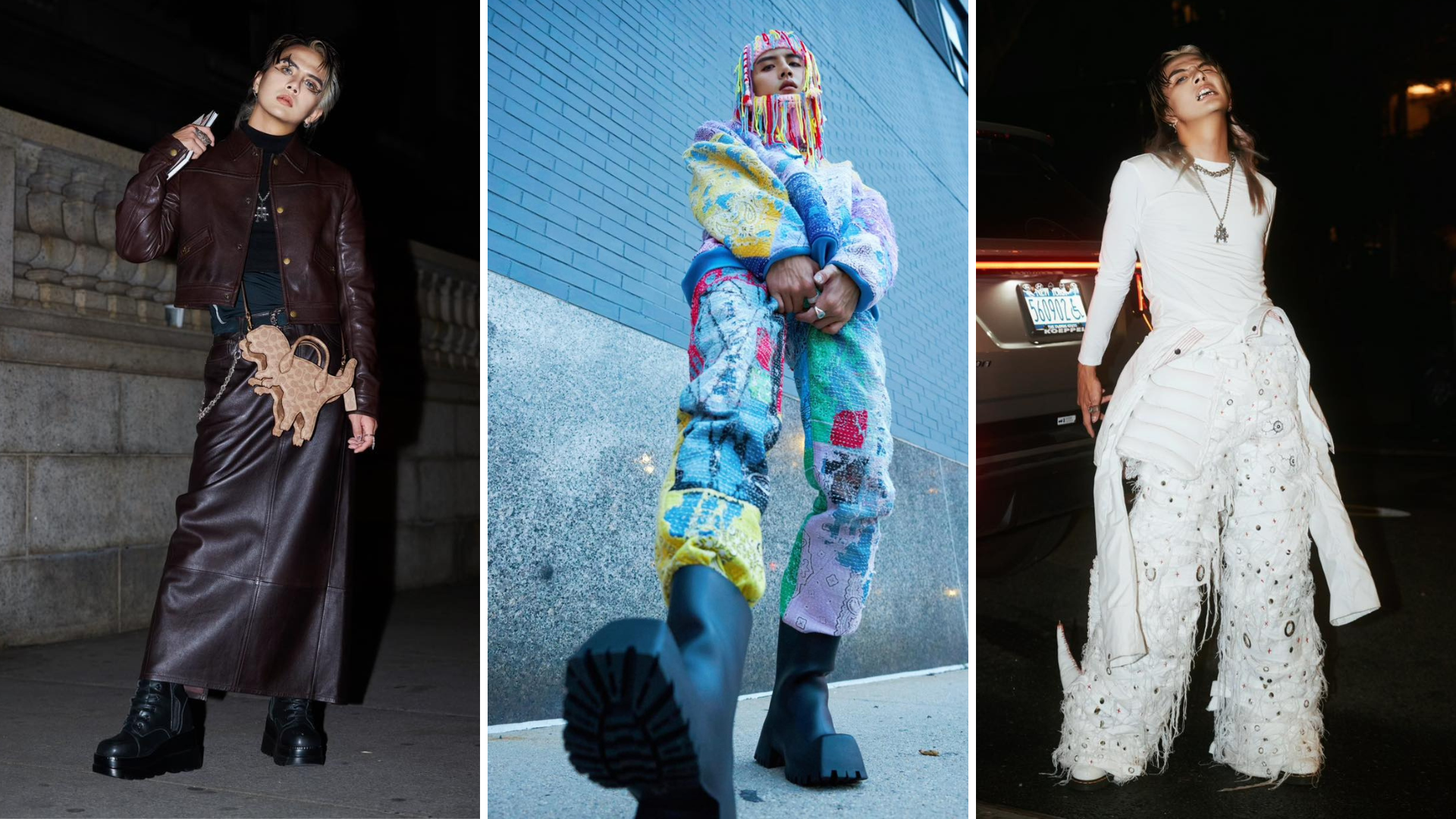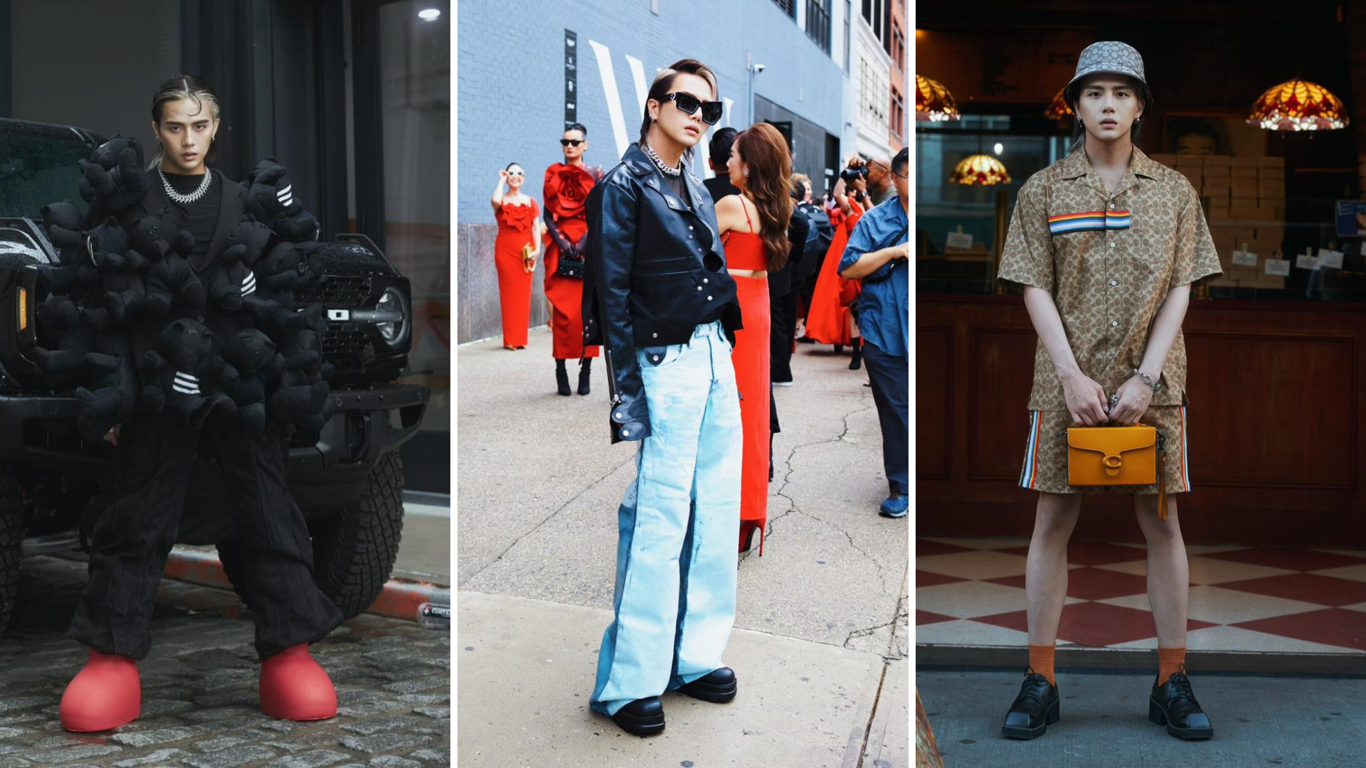 Tuy lần đầu tham gia tuần lễ thời trang quốc tế, nhưng nam diễn viên đã diện trên mình những bộ trang phục táo bạo cùng chất liệu, kiểu dáng và màu sắc riêng biệt, nhất là chiếc áo khoác được làm bằng nhiều chú gấu bông cho đến chiếc quần “quái vật”. Tất cả đều mang đậm bản sắc cá nhân, mang đến vẻ ngoài mãn nhãn, chỉn chu không khác gì một fashionista thực thụ.