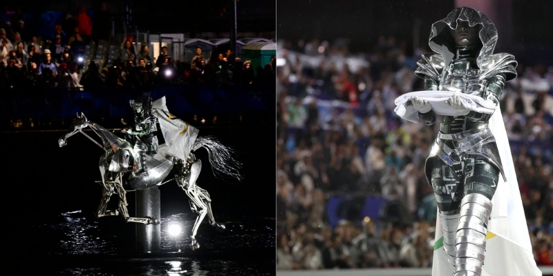 Lễ khai mạc kết thúc đầy ấn tượng với hình ảnh một nữ kỵ sĩ đội mũ trùm đầu, cưỡi một con ngựa bạc cơ khí băng qua sông Seine. Bộ áo giáp của cô được thiết kế bởi nhà thiết kế người Pháp Jeanne Friot, khép lại một màn khai mạc đáng nhớ, tôn vinh sự sáng tạo và tinh thần thể thao của nước chủ nhà Pháp.