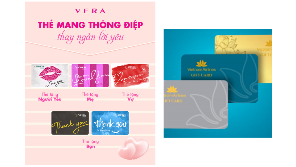 Thay vì đó, bạn có thể tặng thẻ quà tặng điện tử như ở Việt Nam có FPT Shop có voucher với nhiều mệnh giá từ 200.000 đồng cho đến 10.000.000 đồng để người được tặng có thể sử dụng thẻ đó để mua sản phẩm do chính họ thích và quyết định mua. Một vài gợi ý cho những hãng bạn có thể mua E-gift card đó là CGV để xem phim, Phúc Long để mua trà sữa hay VinID để sử dụng những dịch vụ của Vingroup.