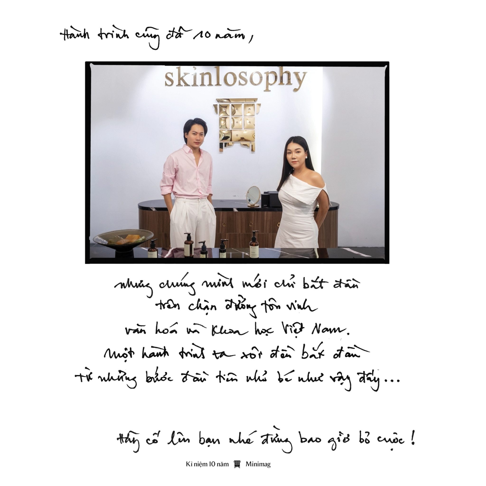 Từ những sản phẩm handmade được đóng gói đơn giản trong những ngày đầu tiên, cho đến khi thành lập trang bán hàng, được siêu thị lớn Aeon Mall gửi lời mời hợp tác, được đồng hành cùng nhiều tổ chức, chiến dịch và được nhiều người tiêu dùng tin tưởng yên mến, Skinlosophy cho đến nay đã vững bước 10 năm trong ngành mỹ phẩm khắc nghiệt.