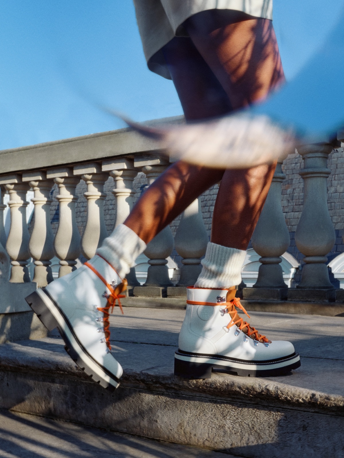 Lấy cảm hứng từ những đôi giày địa hình với bộ đế gai góc và khoen móc dây kim loại, Hermès đem tới mẫu combat boots phối dây buộc màu cam sáng nổi bật, tạo điểm nhấn cá tính như cho một item thanh lịch, cổ điển.