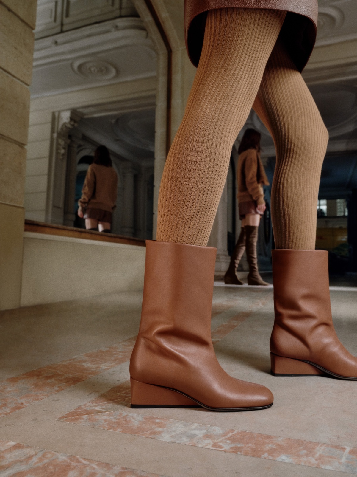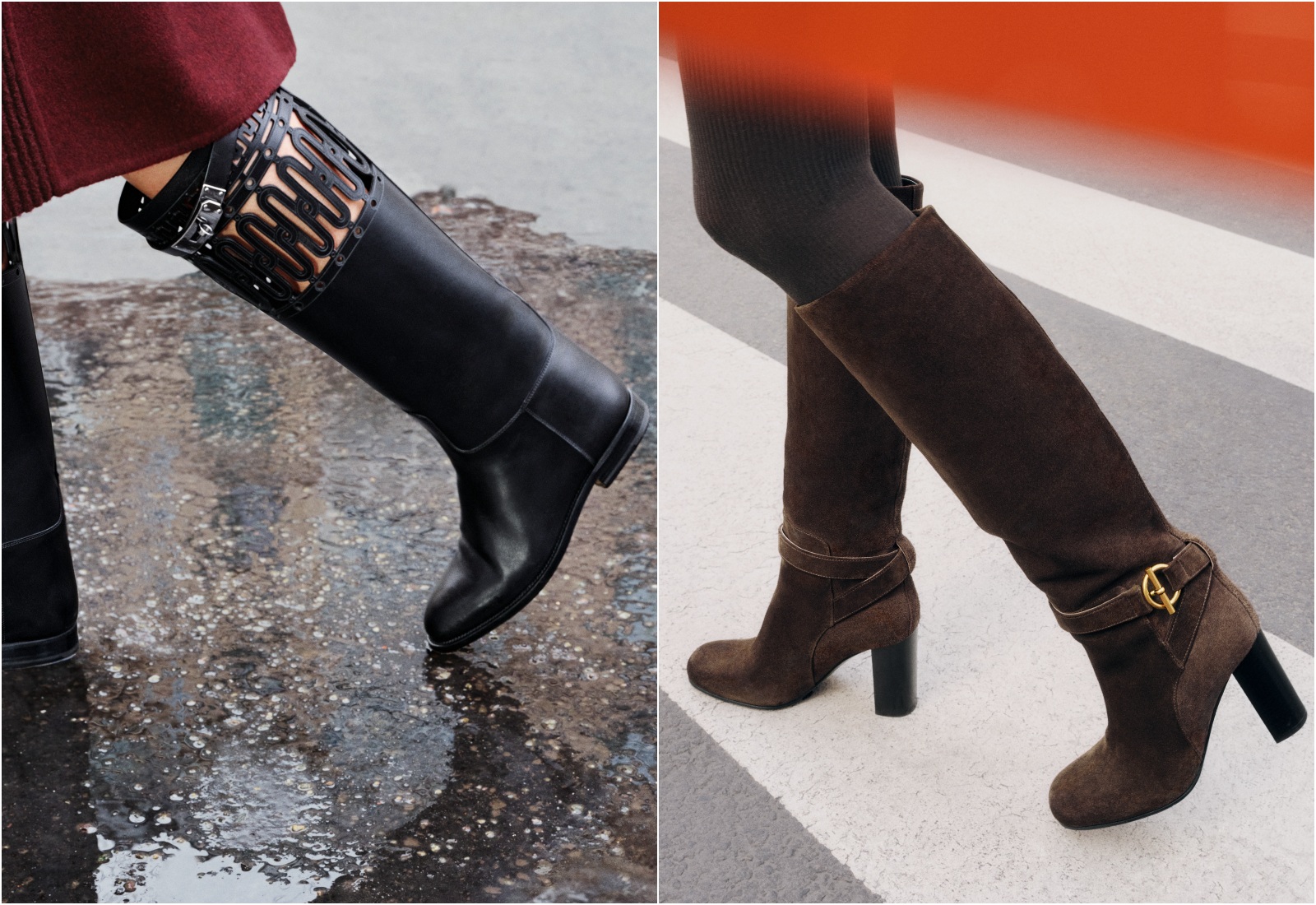 BST giày mùa này tiếp tục chắt lọc di sản từ kho lưu trữ của Hermès. Đó là sự góp mặt của chiếc khóa quen thuộc trên túi Birkin được đính khéo léo vào đôi boots da với kiểu trang trí cut-out tinh xảo.