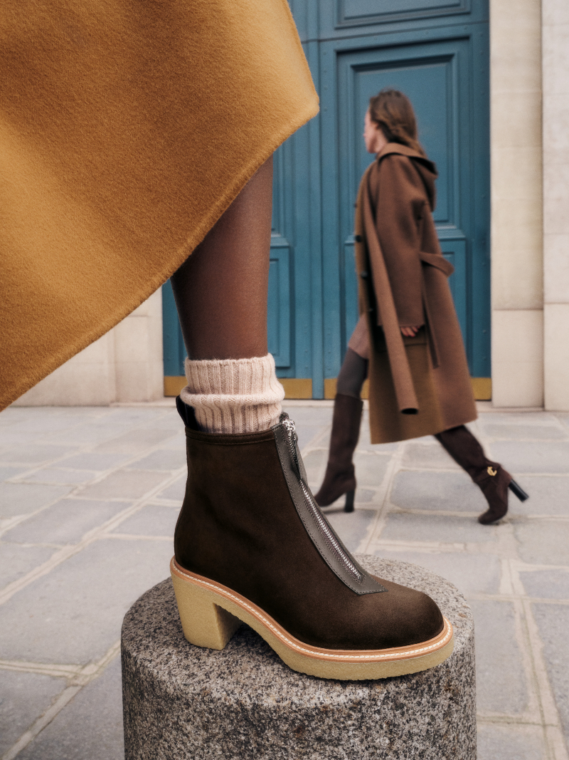 Giày Hermès tuân thủ nghiêm ngặt tư duy thẩm mỹ của thương hiệu: tinh tế và thực dụng. Ankle boots bằng nhung da dê phối da bê màu hạt dẻ được phối khóa kéo ở mặt trước và đế gum mềm mại cho ngày dài thoải mái.