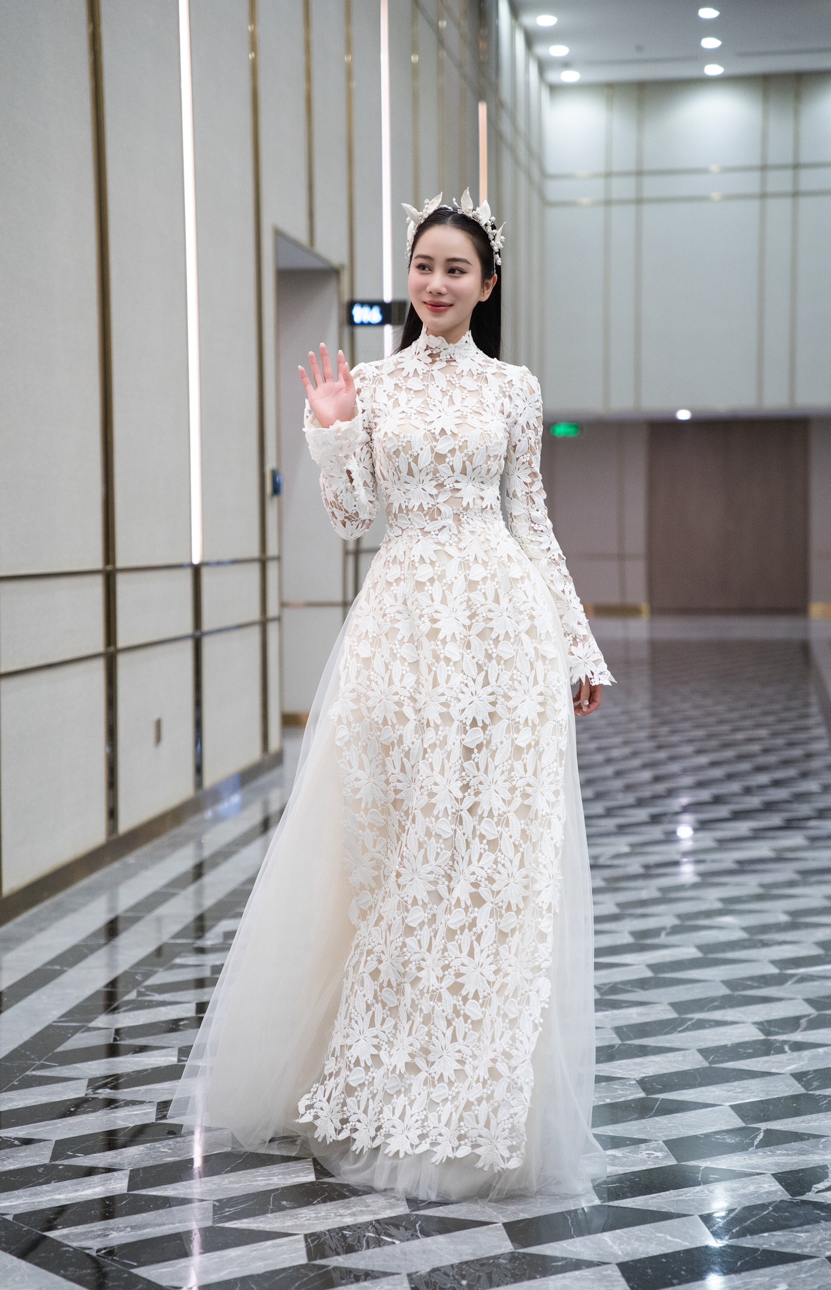 Được biết áo dài Hà Khánh Linh lựa chọn là thiết kế của thương hiệu White Peony Bridal. Bộ áo dài thiết kế theo dáng truyền thống trên chất liệu ren Hàn, toát lên vẻ thuần khiết của người phụ nữ Việt.