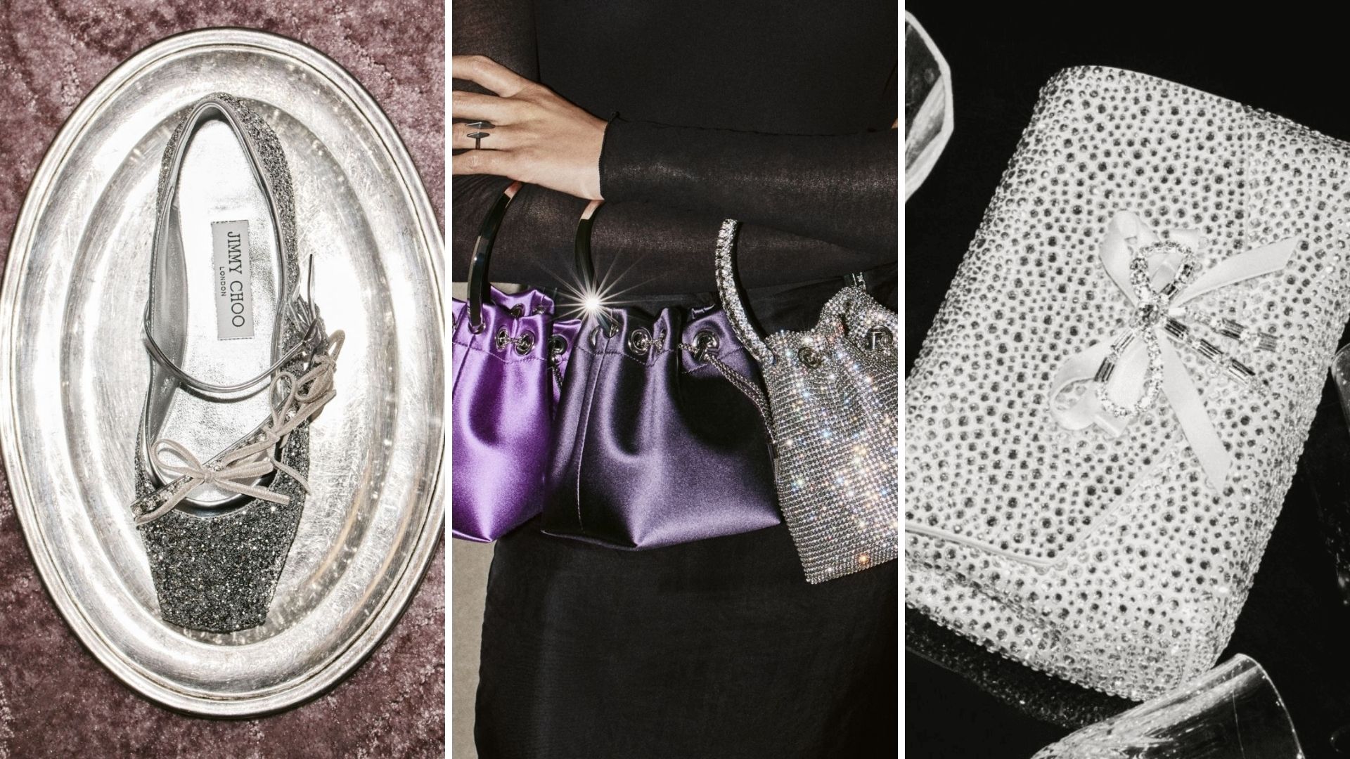 Bộ sưu tập Đông 2025 của Jimmy Choo gói trọn tinh thần lễ hội bằng sự thăng hoa của vẻ đẹp nữ tính. Từng thiết kế đều đề cao sự quyến rũ thông qua những chi tiết điểm nhấn như pha lê, nơ, ren và sắc đá quý trầm ấm, vừa quyến rũ vừa phù hợp cho những buổi tiệc đêm. Từ những đôi Brigitte 100 heels sắc lạnh đến mẫu giày búp bê Loli được lột xác với pha lê và nơ satin hồng, Jimmy Choo mời gọi phái đẹp tỏa sáng trên sàn nhảy. Các mẫu túi xách như Drawstring Mini Top Handle và túi Bon Bon được bao phủ bởi ánh lấp lánh, trở thành những vật phẩm đáng khao khát, hoàn hảo cho một mùa cuối năm đầy hào nhoáng.