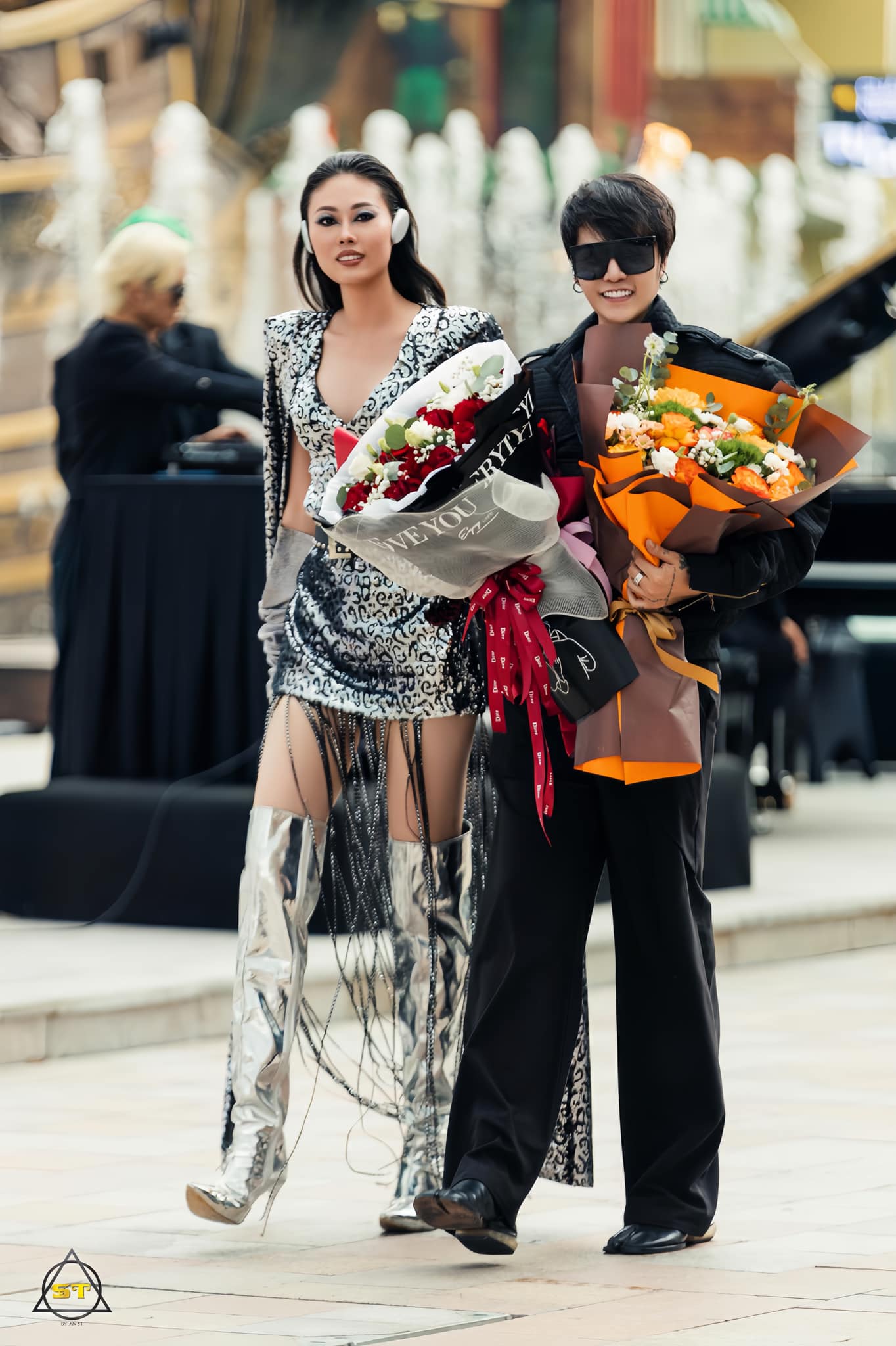 Quán quân Next Top Model 2012 - Mai Giang là người được "chọn mặt gửi vàng" để giữ trọng trách vedette kết màn. Trong set đồ với tone bạc chủ đạo xen kẽ họa tiết đen nổi bật, cô bước đi mạnh mẽ đầy cuốn hút trên đường băng runway.