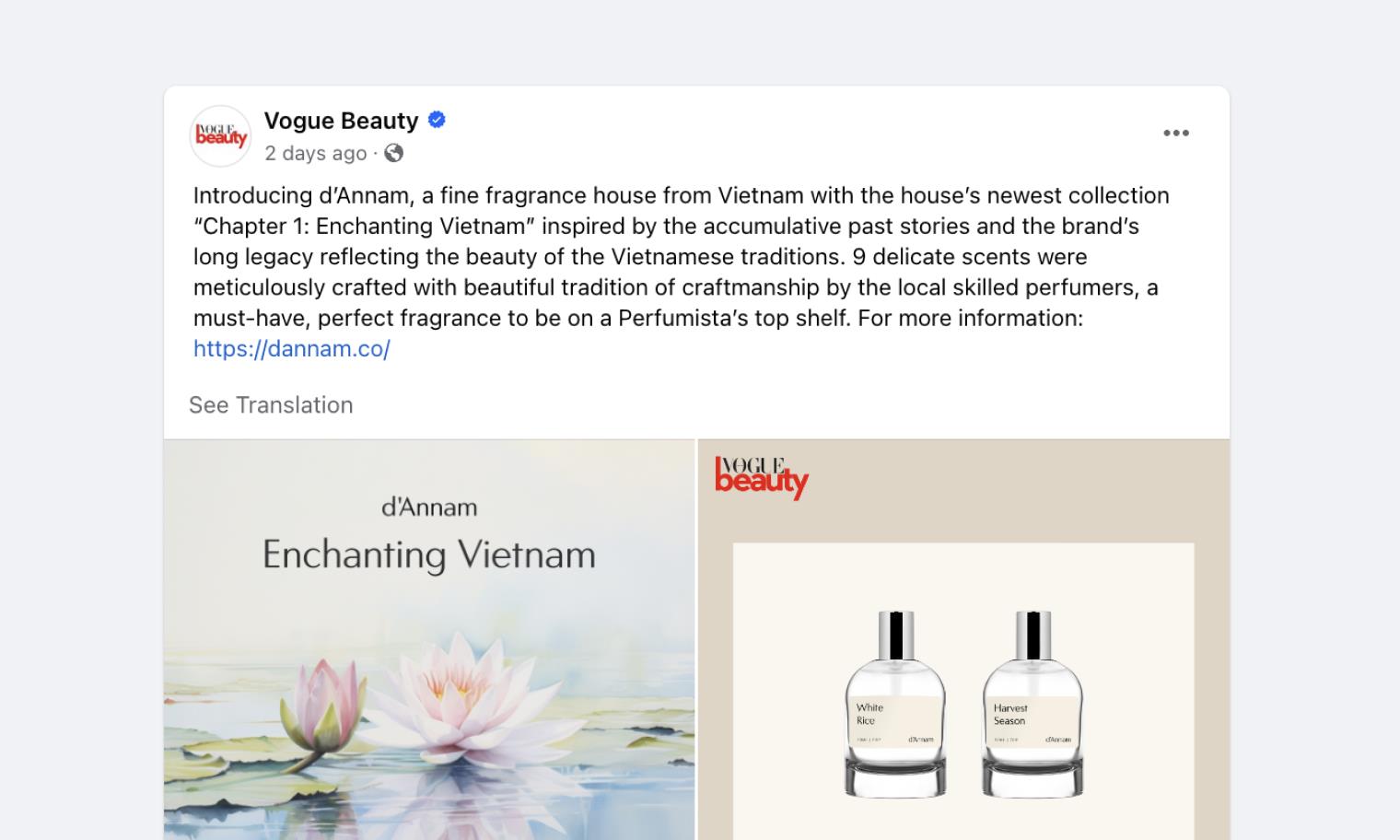 Mới đây, thương hiệu d'Annam đã ra mắt bộ sưu tập nước hoa đầu tay "Enchanting Vietnam" (Việt Nam diệu kỳ). Lấy cảm hứng từ di sản văn hóa phong phú của Việt Nam, bộ sưu tập này là một cuốn hồi ký giàu cảm xúc, tôn vinh cảnh quan và văn hóa đất nước.