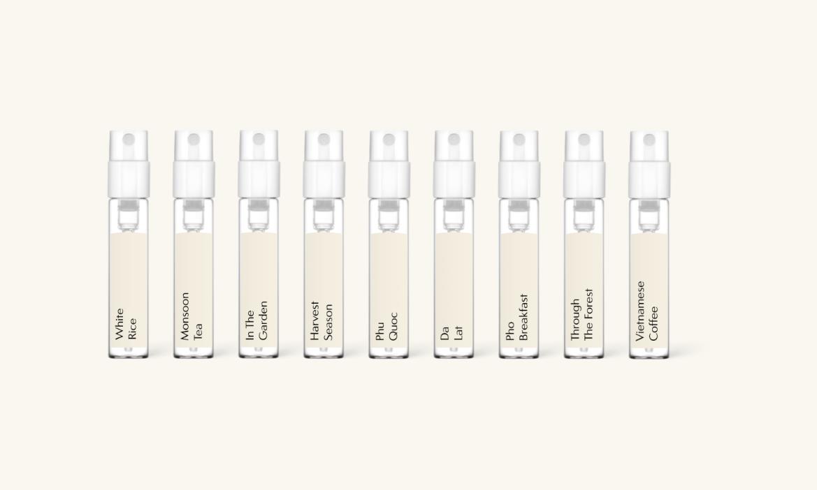 Cụ thể, bộ sưu tập nước hoa bao gồm 9 mùi hương: Pho Breakfast - lấy cảm hứng từ phở, White Rice - hương thơm của hạt gạo ngọt bùi, Vietnamese Coffee - vị cà phê Robusta rang đậm, Monsoon Tea - vị trà xanh sau cơn mưa; In The Garden - hương hoa nhài trong ký ức vườn nhà ngoại; Harvest Season - hương thơm của lúa mới gặt và rơm khô; Phu Quoc - hương biển tươi mát; Da Lat - mùi hương hoa hồng được làm mới. Dòng cuối cùng là Through The Forest mang mùi hương của gỗ trầm hương. Có thể thấy, 9 dòng hương như tác phẩm nghệ thuật, tôn vinh biểu tượng văn hóa, ẩm thực Việt.