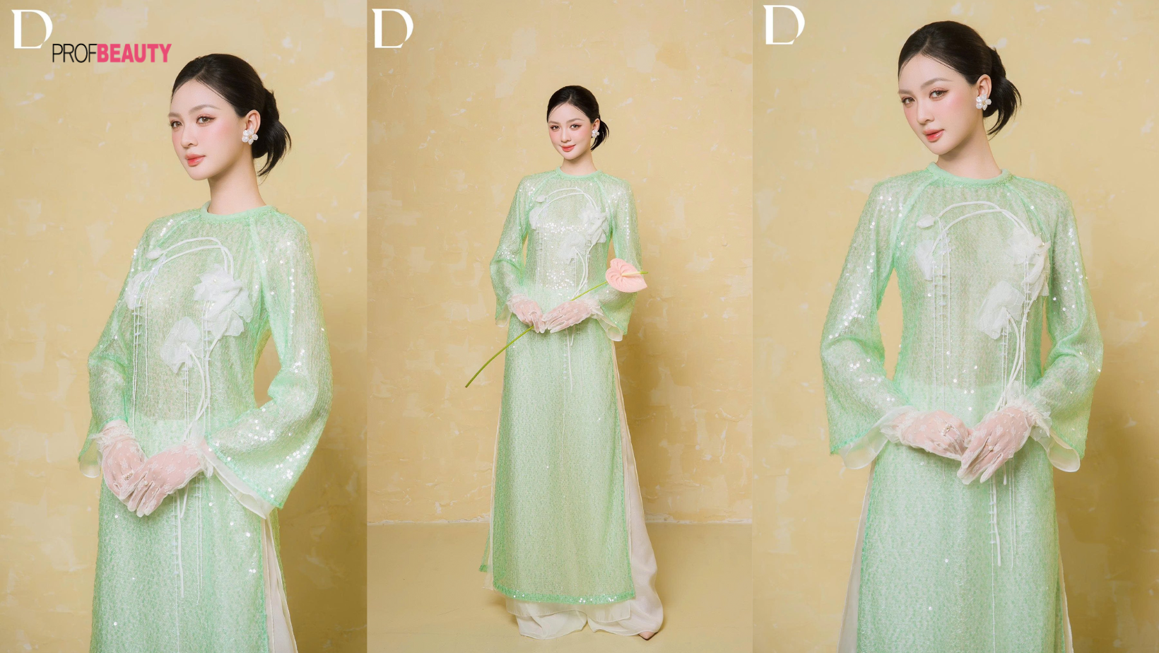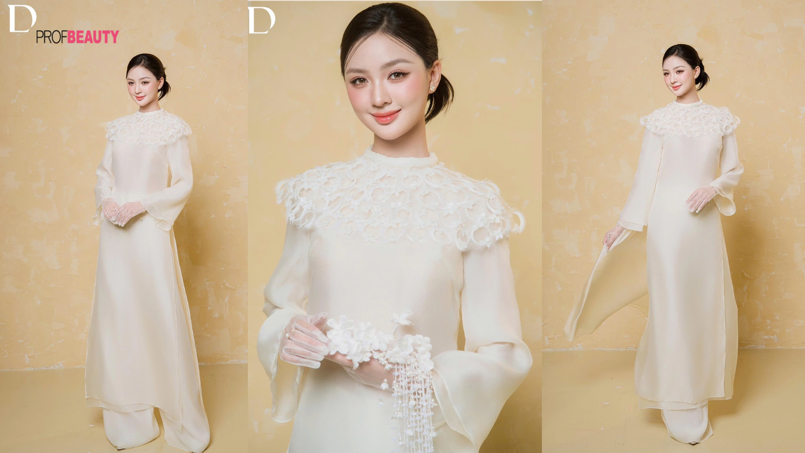Với Em Mai, NTK Đỗ Long chọn cách tiếp cận mềm mại hơn. Gam Meringue kết hợp lông vũ tạo cảm giác nhẹ tênh gợi nhắc sắc xuân quen thuộc nhưng không cũ. Hoa mai xuất hiện như một điểm nhấn tinh tế không phô diễn mà lặng lẽ gợi ký ức Tết trong tâm thức người Việt.