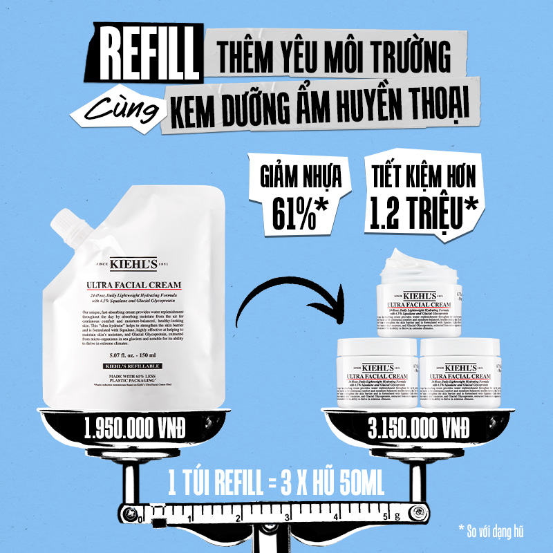 Túi tiếp nạp kem dưỡng (refill) Kiehls Ultra Facial Cream: Khi chọn lựa sản phẩm này, các tín đồ làm đẹp đã góp phần làm giảm lượng nhựa sử dụng thải ra môi trường với chi phí tiết kiệm hơn. Mỗi túi tiếp nạp sản phẩm kem này có thể tích 150ml tương ứng với 3 lọ kem dưỡng, tính ra giá thành thì bạn đang tiết kiệm cho mình đến hơn 1 triệu 200 ngàn đồng và cùng lúc giúp giảm thiểu đến 61% lượng nhựa thải ra môi trường. Các túi Refill hiện đang có sẵn trên trang web chính hãng Kiehl’s và tất cả cửa hàng Kiehl's trên toàn quốc.