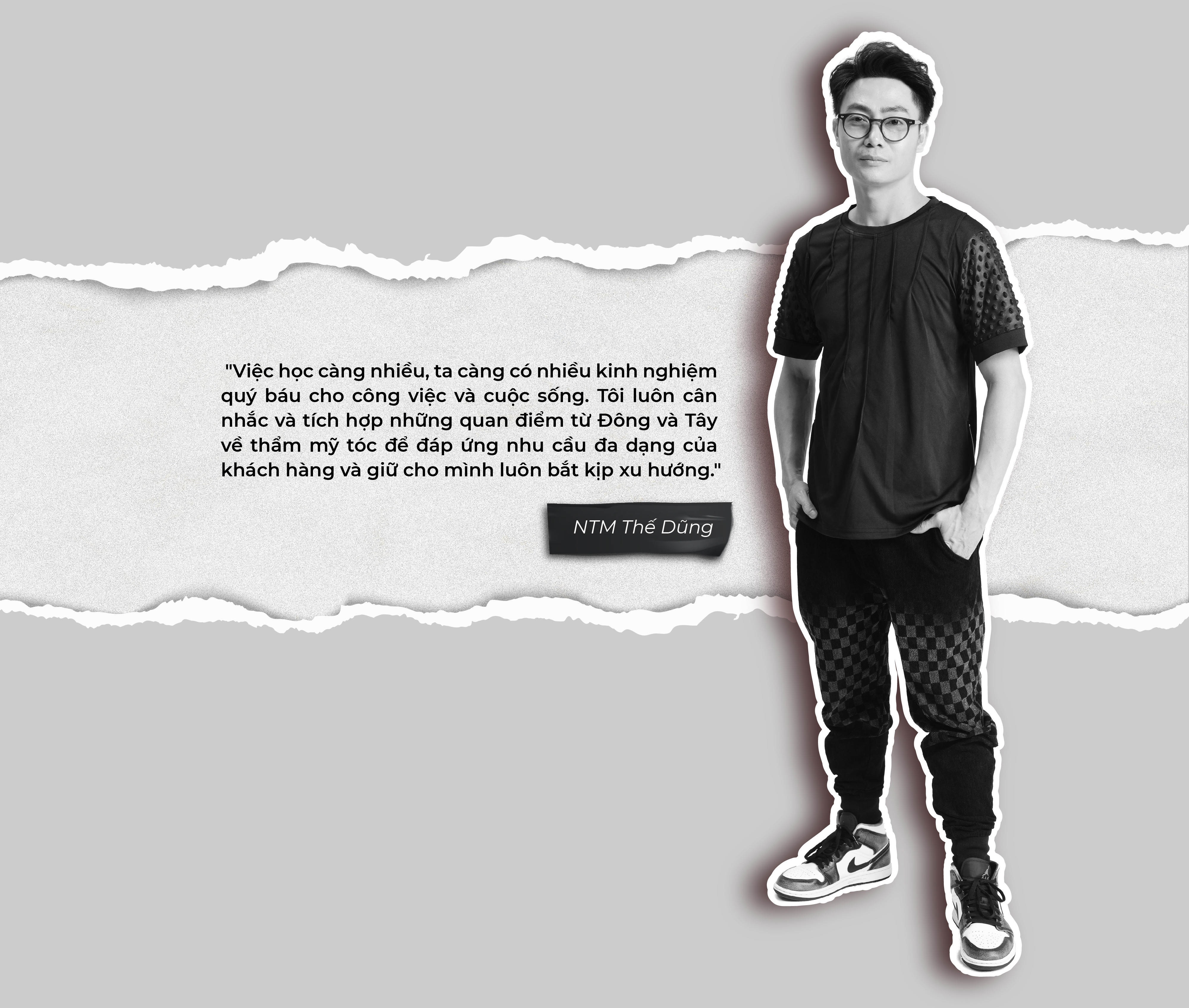 Từ các kiểu cắt tóc cổ điển đến xu hướng hiện đại, anh luôn cố gắng thích nghi và sáng tạo để đáp ứng nhu cầu đa dạng của khách hàng. "Công việc của tôi khá thú vị. Tôi tiếp xúc với đa dạng đối tượng khách hàng từ các ngành nghề và từ mọi lứa tuổi khác nhau. Mỗi người mang lại những yêu cầu riêng biệt về kiểu tóc của họ, từ những kiểu đơn giản, dễ chăm sóc đến những kiểu tóc phức tạp, thời thượng và trendy." NTM Thế Dũng chia sẻ.
