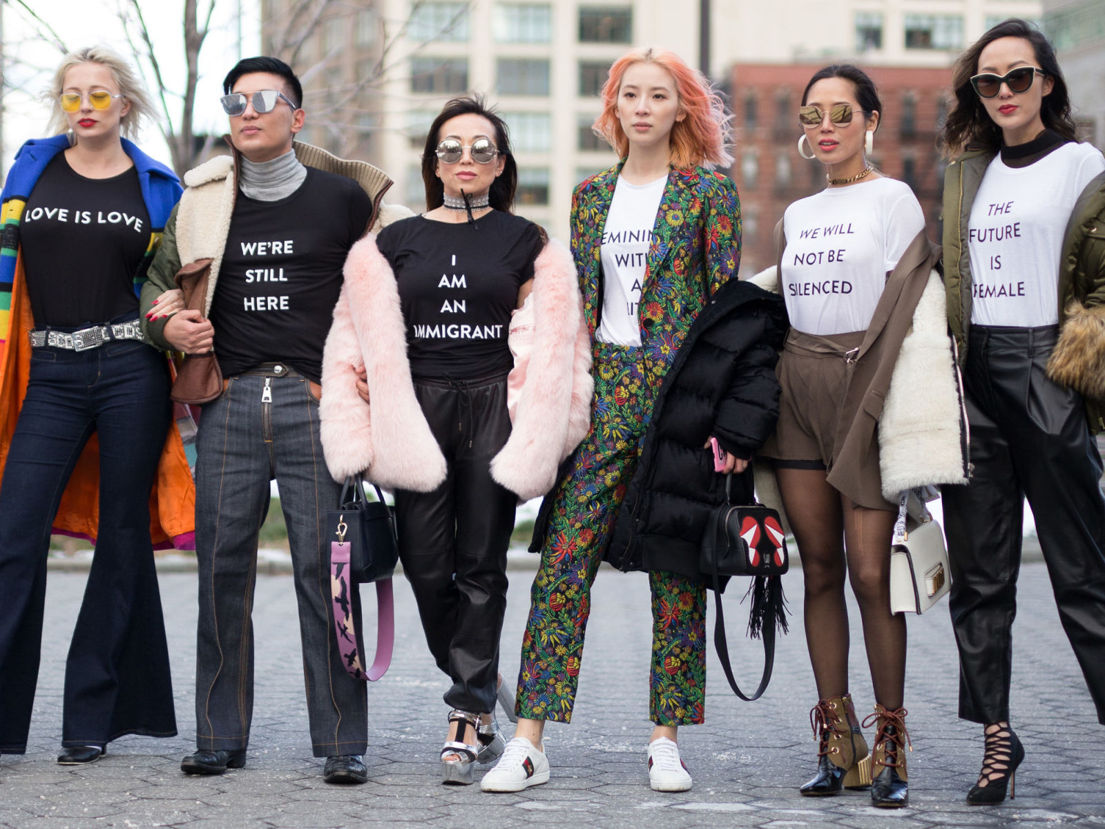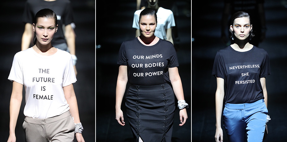NTK Prabal Gurung đã kết thúc chương trình Thu Đông 2017 tại New York Fashion Week bằng một màn catwalk ấn tượng: dàn người mẫu, Bella Hadid dẫn đầu và bao gồm cả người mẫu plus-size Candice Huffine và Marquita Pring, đã cởi bỏ những chiếc áo choàng lông xa hoa và bộ cánh điệu đà để lộ ra những chiếc áo phông xuất hiện với một loạt slogan mang thông điệp nữ quyền như “The Future is Female”, “Voices for Choices”, “Our Minds Our Bodies Our Power”, “We Will Not Be Silenced”.