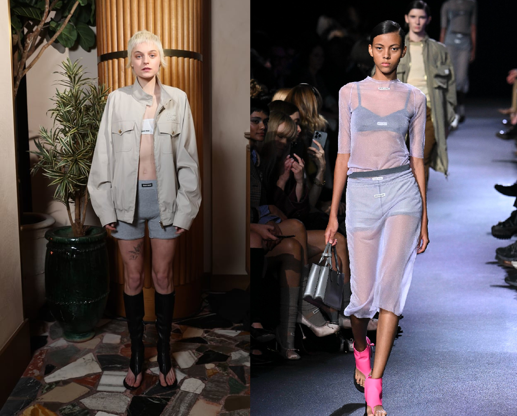 Tại sàn diễn BST Xuân Hè 2022, nhà mốt Miu Miu đã khai sáng style ăn mặc phóng khoáng này, biến boxer shorts trở thành món đồ phổ biến đối với chị em phụ nữ. Với những chiếc váy xếp ly ngắn cũn đi kèm thắt lưng cực thấp với mục đích là làm lộ ra phần quần boxer bên trong. Điều này đã đẩy độ phủ sóng khắp các mặt trận mạng xã hội, nâng tầm những chiếc quần đùi lên một level mới.