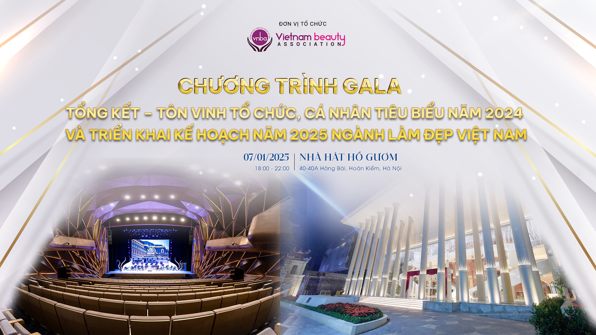 Sự kiện “Gala Tổng Kết - Tôn vinh tổ chức, cá nhân tiêu biểu 2024 và triển khai kế hoạch năm 2025 ngành làm đẹp Việt Nam” sẽ diễn ra tại Nhà hát Hồ Gươm, ngày 07/01/2025, hứa hẹn không chỉ là dịp tôn vinh những thành tựu xuất sắc trong ngành làm đẹp, mà còn mở ra cơ hội hợp tác, phát triển, khẳng định vị thế của ngành làm đẹp Việt Nam trên bản đồ Quốc tế.
