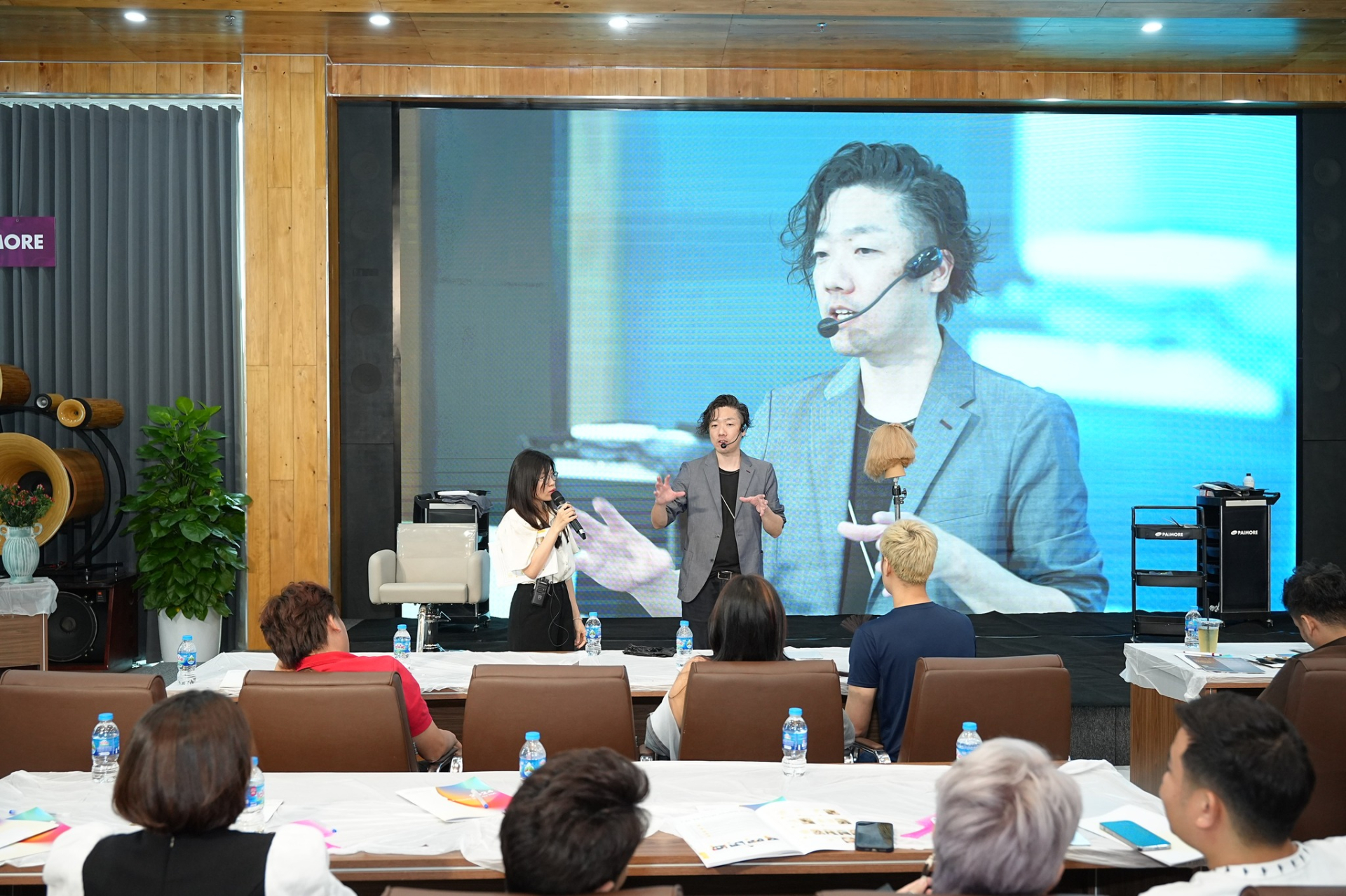 Mở đầu buổi workshop, ông Harumasa Murakami đã giúp các NTM hiểu sâu hơn về các nguyên lý màu sắc. Những kiến thức này không chỉ mang tính lý thuyết mà còn được áp dụng thực tế để tạo ra những gam màu tinh tế và bền đẹp. Các NTM đã được hướng dẫn cách phân tích và lựa chọn màu sắc phù hợp nhất cho từng loại tóc.